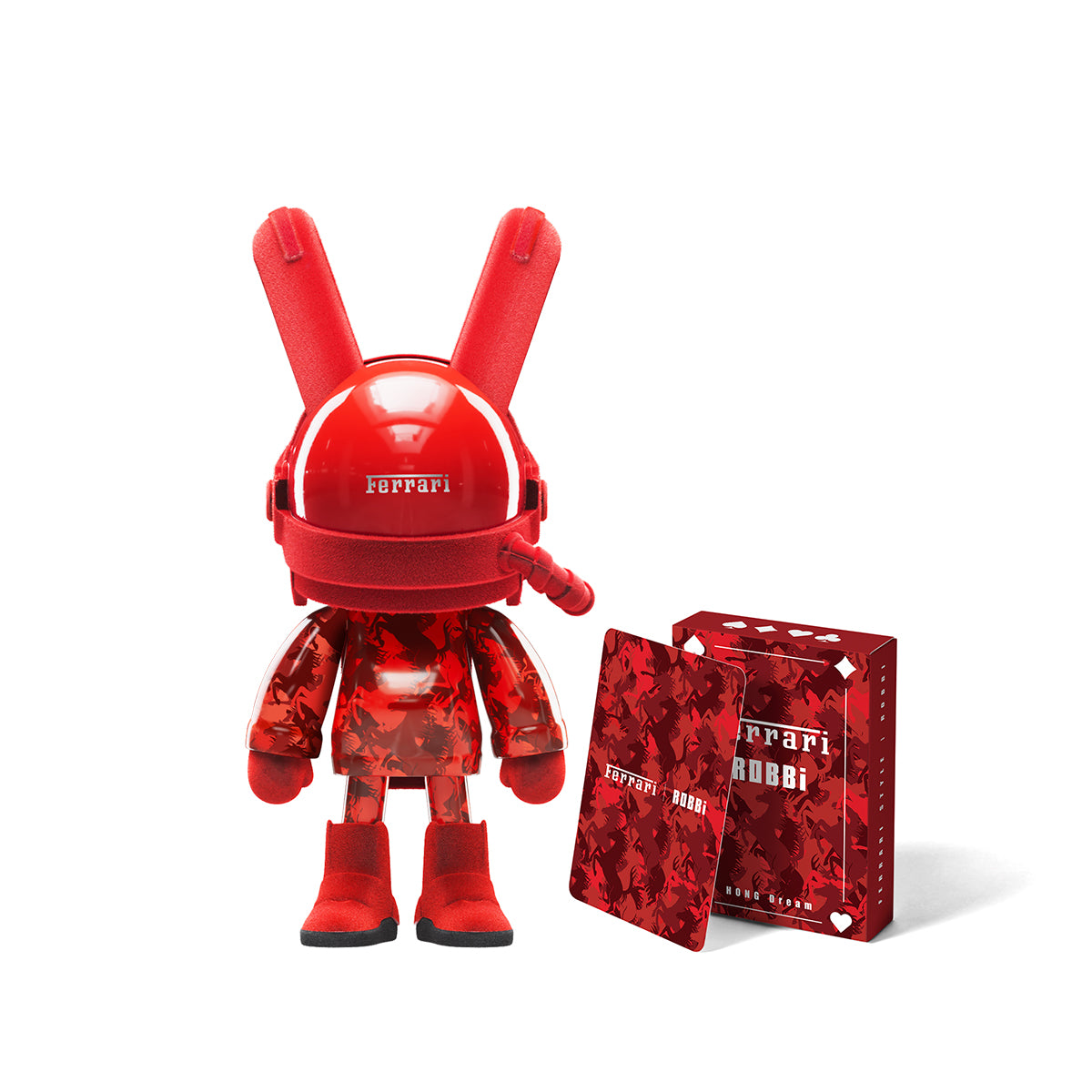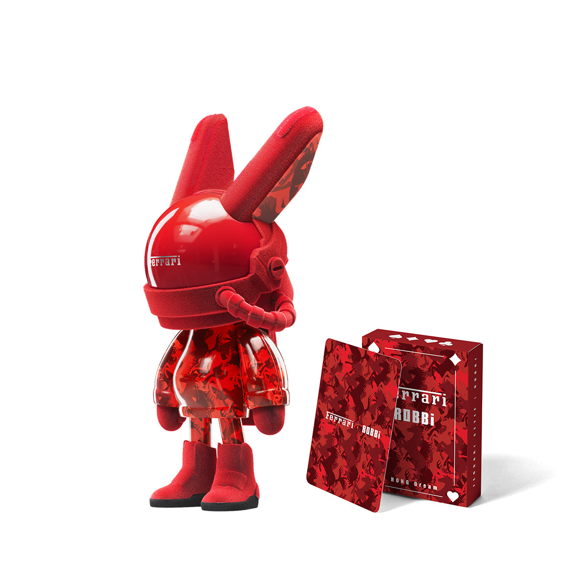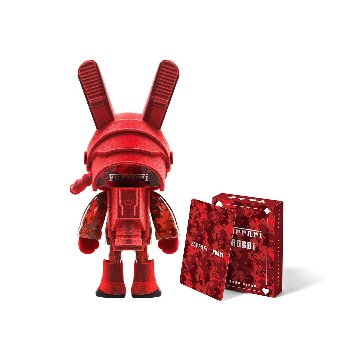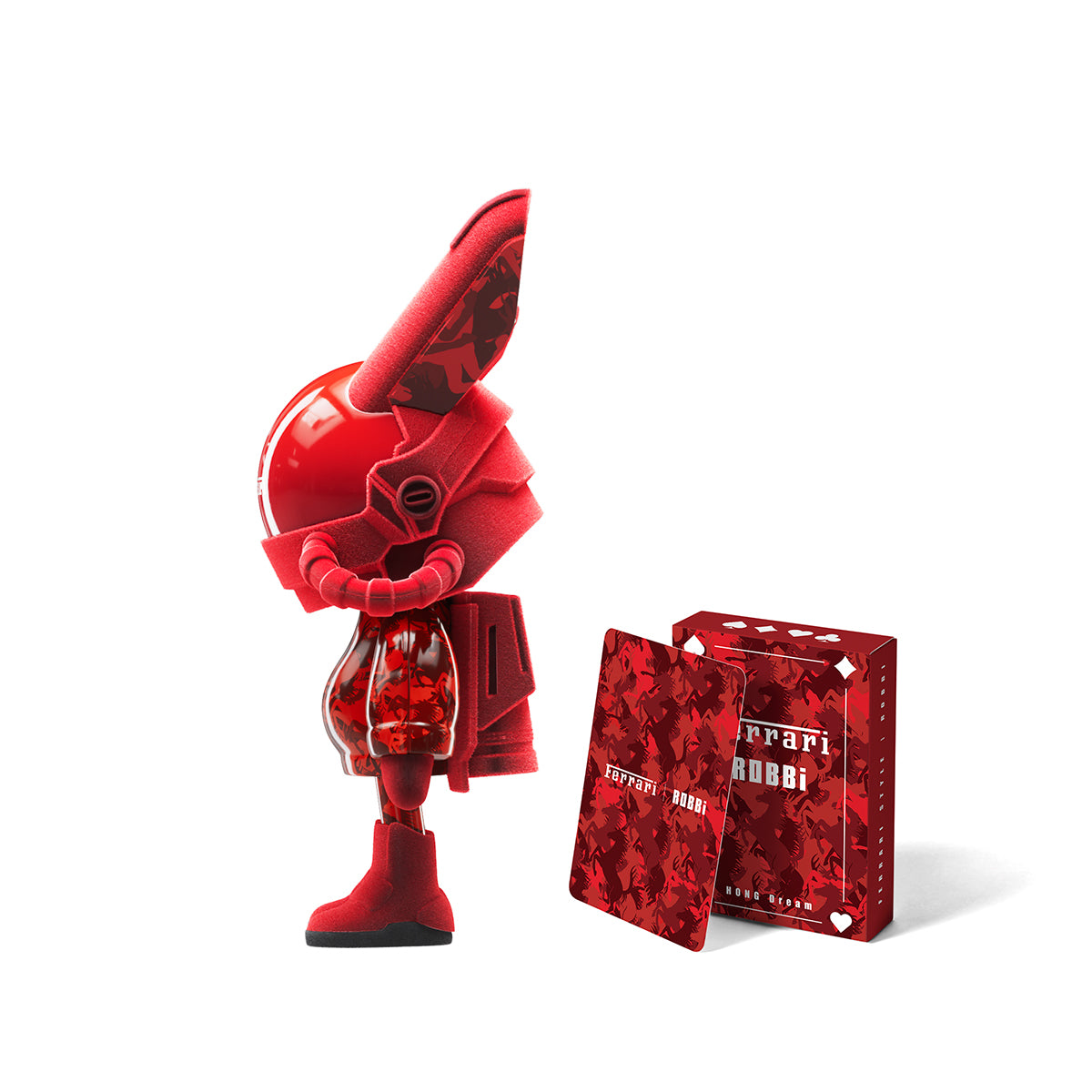 < HONG Dream > Playing Cards from the < HONG > collection series feature a Texas Hold'em standard pack. The card surface features a matte PVC finish for smooth tactile impression and durability. The packaging design is inspried from the classic FERRARI horse pattern. Card design features a bold red-and-black color scheme with ROBBifigure, blending retro racing aesthetics with modern street culture. Each set includes an exclusively numbered Artist Collectible Card, symbolizing the collectible value, spirit of boldness, and creative fusion that defines the < HONG Dream > universe.