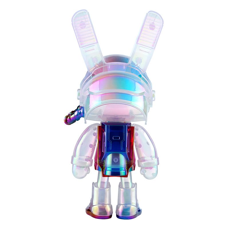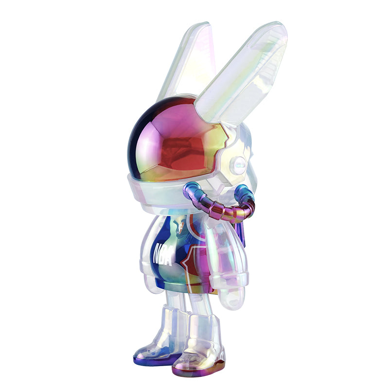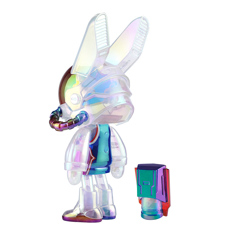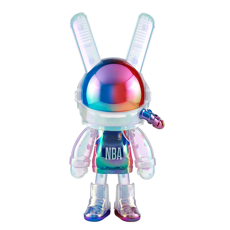 The art toy is in the color of pearlescent white, wearing an NBA jersey and a blue-and-red transparent gradient mask, a classic NBA